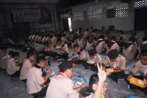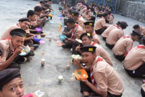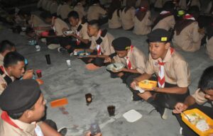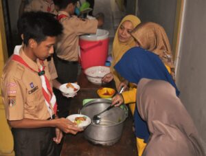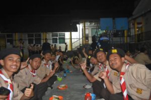Kegiatan pendirian tenda kemah berlangsung hingga matahari terbenam. Agenda kegiatan berikutnya yaitu istirahat, solat dan makan. Makanan disajikan oleh Sie konsumsi yaitu Susi Sukenti, S.Pd, Rejeki Wardiyati, S.Pd dan dibantu para guru. Peserta disiapkan dan makan dengan lahap. Setelah makan dan istirahat sebentar, energi peserta pun terisi kembali.