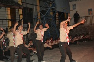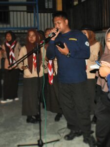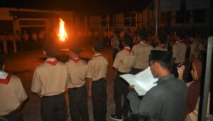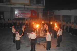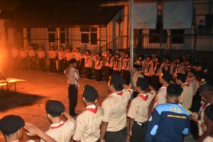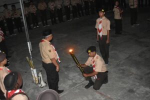 Kegiatan dilanjutkan ke salah satu kegiatan utama di hari pertama yaitu upacara api unggun dan pentas seni. Upacara api unggun dipimpin oleh Pak Syaiful dengan kondisi minim pencahayaan. Pak Syaiful memberikan arahan tentang pentingnya pramuka untuk pembentukan karakter. Upacara ditutup dengan penyalaan obor oleh pak Syaiful dilanjutkan ke pembawa obor. Satu persatu obor dinyalakan secara estafet sambil melafalkan dasa darma dengan lantang. Setelah api unggun sudah jadi, upacara ditutup.